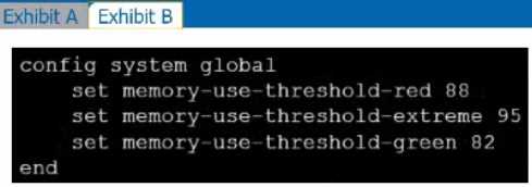 Exhibit A shows system performance output. Exhibit B shows a FortiGate configured with the default