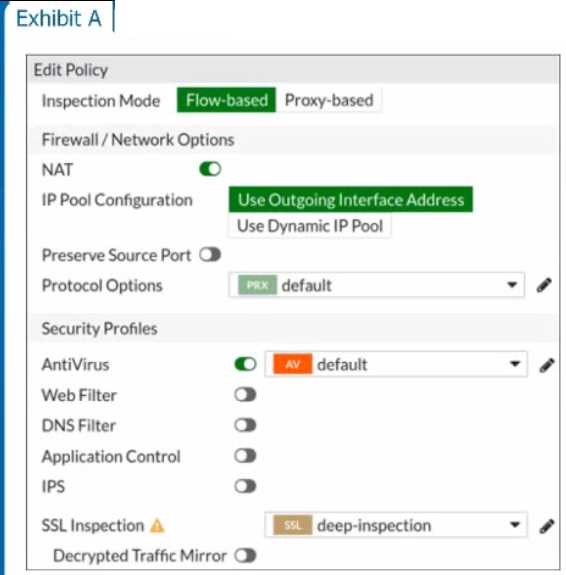 Refer to the exhibits to view the firewall policy (Exhibit A) and the antivirus profile (Exhibit B).