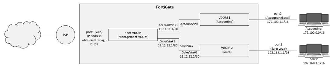 and VDOM 2 are used for segregating internal traffic. AccountVInk and SalesVInk are standard VDOM