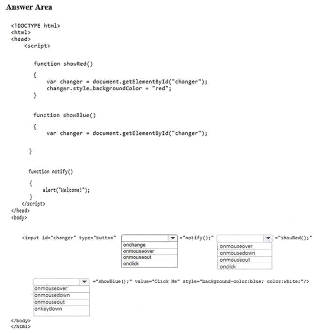 You are designing a web page that contains a blue button. When the button is pressed, it should call a function that displays