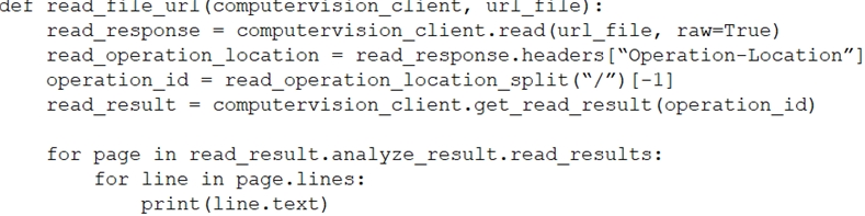 You are developing a method that uses the Computer Vision client library. The method will perform optical character recognition (OCR) in images. The method has the following code.