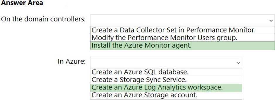 What should you do on the domain controllers, and what should you create on Azure? To answer, select the appropriate options in the answer area.