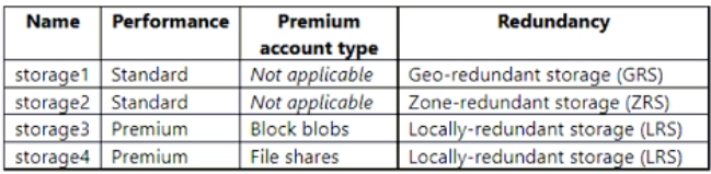 You have an Azure subscription. The subscription contains a virtual machine named VM1 that runs Windows Server. The subscription contains the storage accounts shown in the following table.