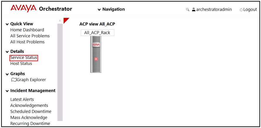 An administrator notices that the Rack View of Avaya Orchestrator is highlighted with a Red X on the