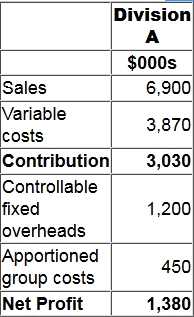 Division A is an investment centre with assets of $7.3 million. The following is an extract from the