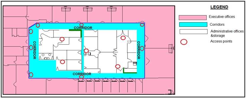 four buildings and a warehouse with access points that provide full wireless coverage as well as a