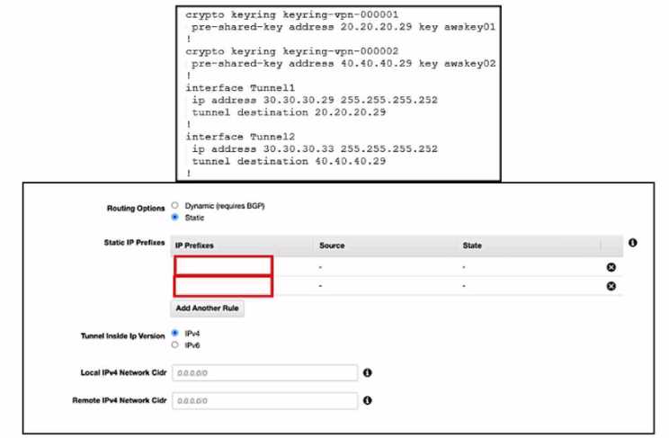 the Cisco IOS XE router. The AWS routing options should include the local and remote IP prefixes that