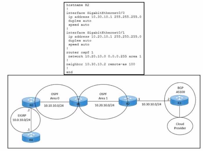 Refer to the exhibits. An engineer must redistribute IBGP routes into OSPF to connect an on-premises