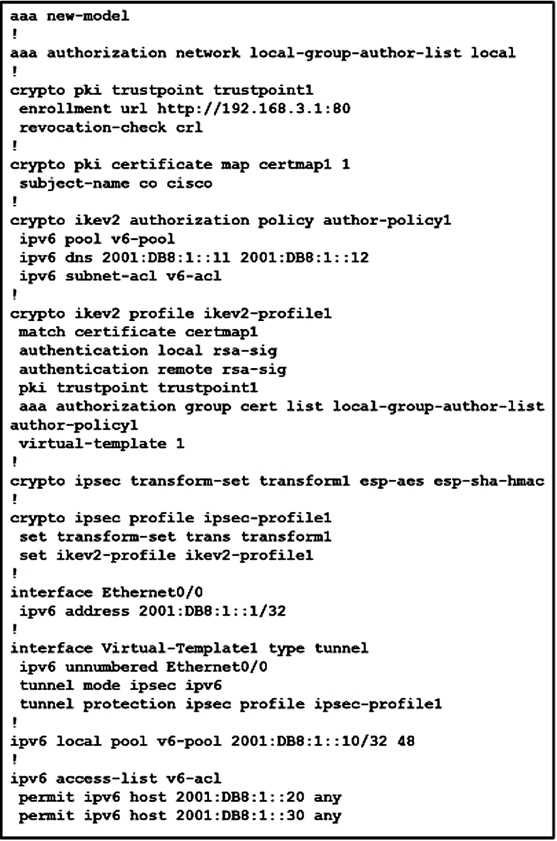 the IKEv2 keyring, the authentication method, the identity of the peers, and other options.