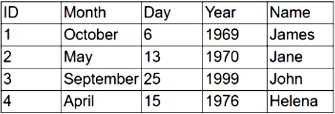 Month, Day, Year, and Name may have duplicates and do not guarantee uniqueness.