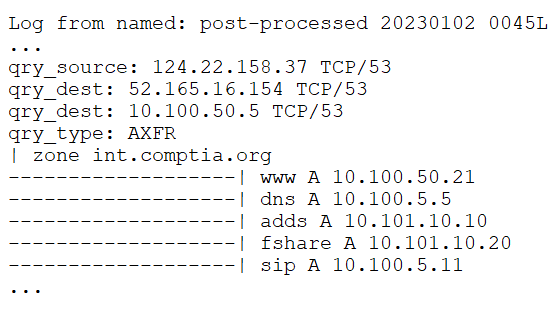 A security analyst is reviewing the logs on an organizations DNS server and notices the following unusual snippet: