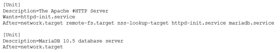 A Linux administrator has installed a web server, a database server, and a web application on a server. The web application should be active in order to render the web pages. After the administrator restarts the server, the website displays the following message in the browser: Error establishing a database connection. The Linux administrator reviews the following relevant output from the systemd init files: