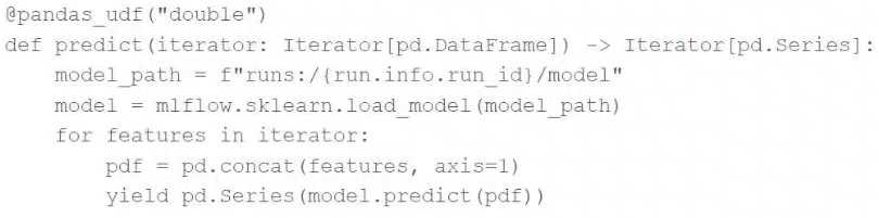A data scientist has defined a Pandas UDF function predict to parallelize the inference process for a