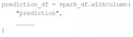 They have written the following incomplete code block to use predict to score each record of Spark