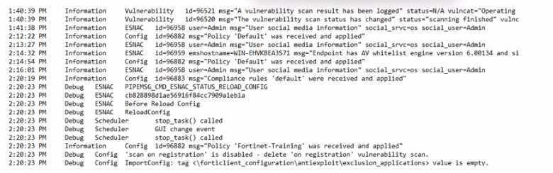 The logs show a policy named "Fortinet-Training" being applied to the endpoint.