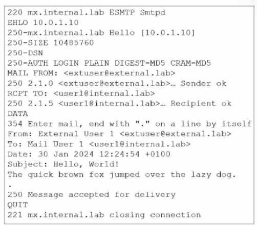 Refer to the exhibit, which shows the output of an email transmission using a telnet session.