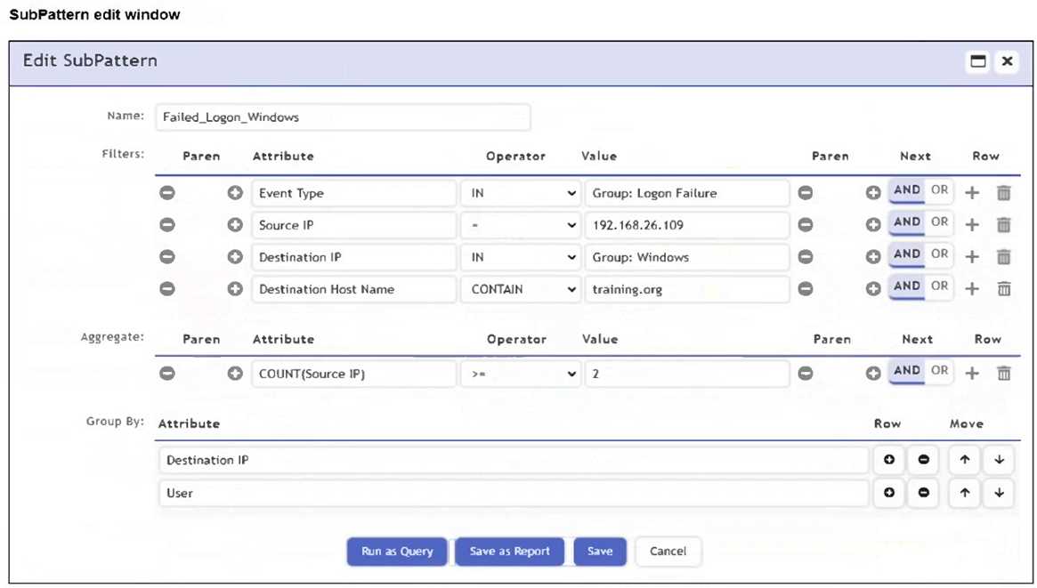 The Group By attributes - Destination IP and User - cause the aggregation (COUNT(Source IP) >= 2)