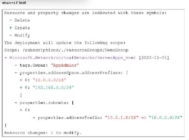 An administrator used the what-if tool to preview changes to an Azure Bicep file.