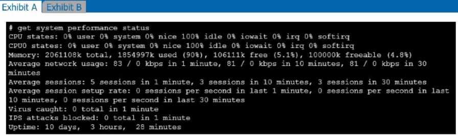 Exhibit A shows system performance output. Exhibit B shows a FortiGate configured with the default