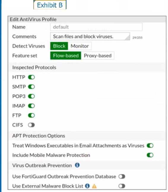 Refer to the exhibits to view the firewall policy (Exhibit A) and the antivirus profile (Exhibit B).