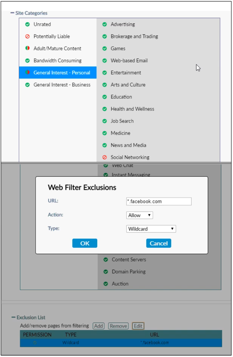 Based on the settings shown in the exhibit, which action will FortiClient take when users try to access www facebook.com?