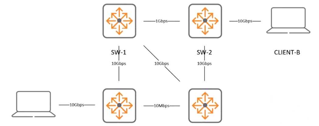 All ports are routed, and ECMP is enabled, with other default parameters for OSPF. What will be the