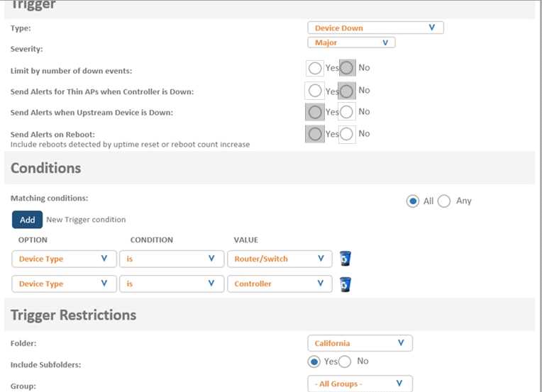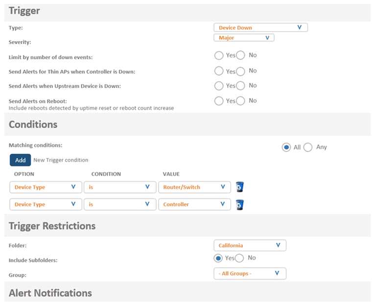 A network administrator wants to receive a major alarm every time a controller or an Aruba switch