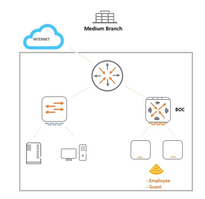 A 7008 Branch Office Controller (BOC) is deployed in a remote office behind a core router. This core