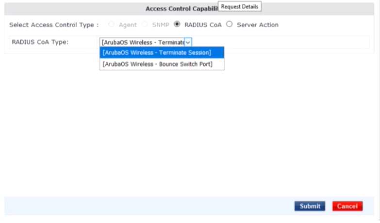 access tracker, you see only the ArubaOS Radius terminate session options and not the Cisco vendor