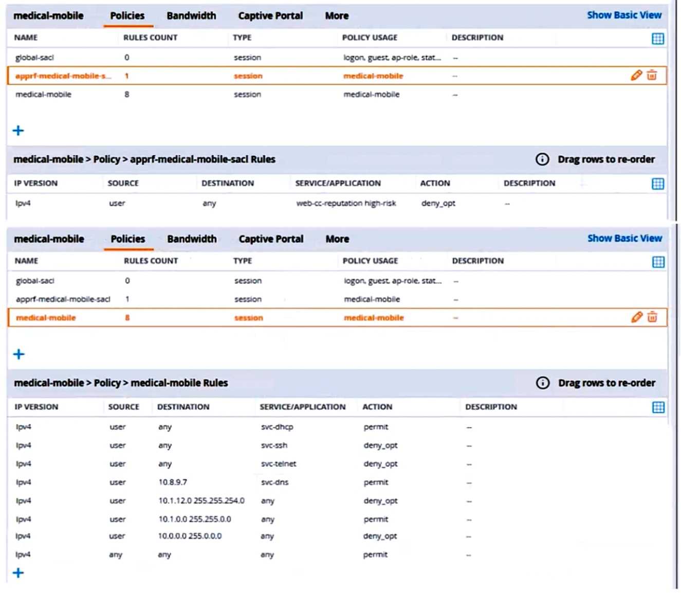 example, “medical-mobile” rule 1 is “ipv4 any any svc-dhcp permit,” and rule 6 is “ipv4 any any any