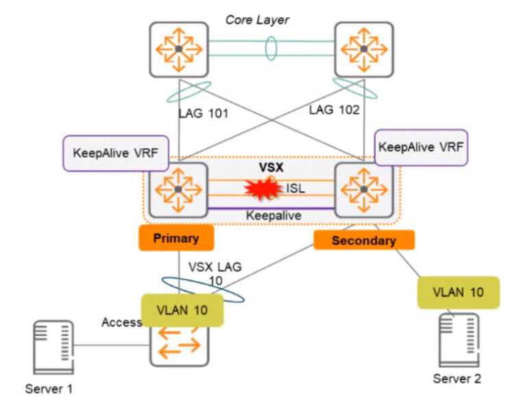 access the core layer via its uplink to VSX-B, which is still active for VLAN 10 because of Active