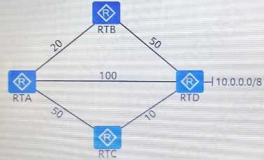 figure. What is the cost value of the route entry to the network 10.0.0.0/8 in the RTA routing table? ()