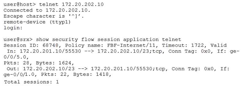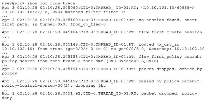 The exhibit shows a snippet of a security flow trace. A user cannot open an SSH session to a server.