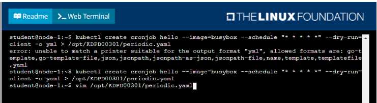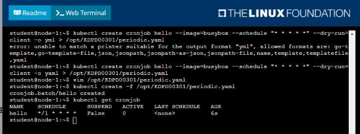 • Create a YAML formatted Kubernetes manifest /opt/KDPD00301/periodic.yaml that runs the