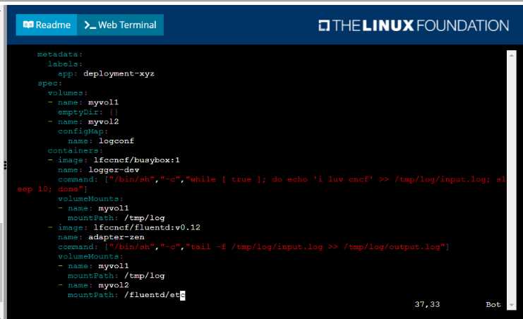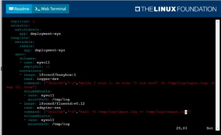 Mounts a shared volume /tmp/log on both containers, which does not persist when the pod
