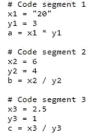 Code Segment 1: You cannot convert str to int. x1 = 2 is a string. Therefore code will produce an error. Code Segment