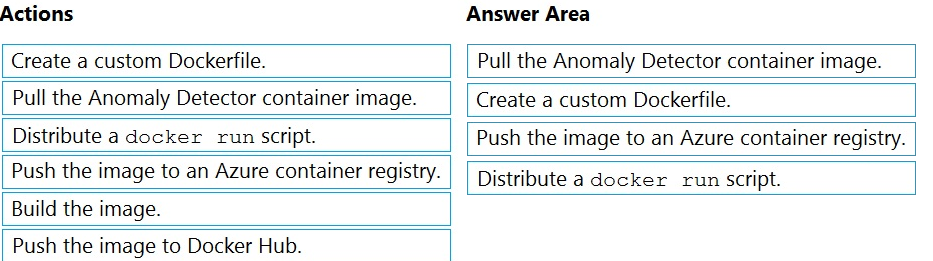 DRAG DROP You plan to use containerized versions of the Anomaly Detector API on local devices for testing and in on-premises datacenters.