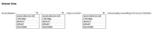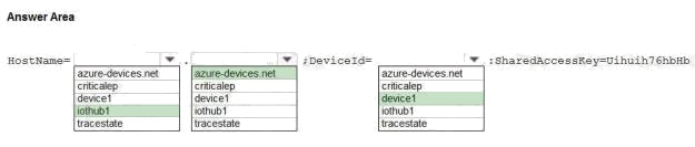 How should you complete the device connection string? To answer, select the appropriate options in the answer area.