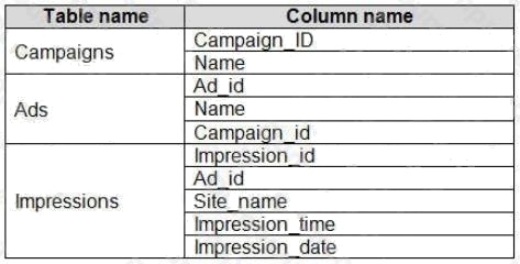 Present ad impression counts for the day, campaign, and Site_name. The analytics for the last year are required.