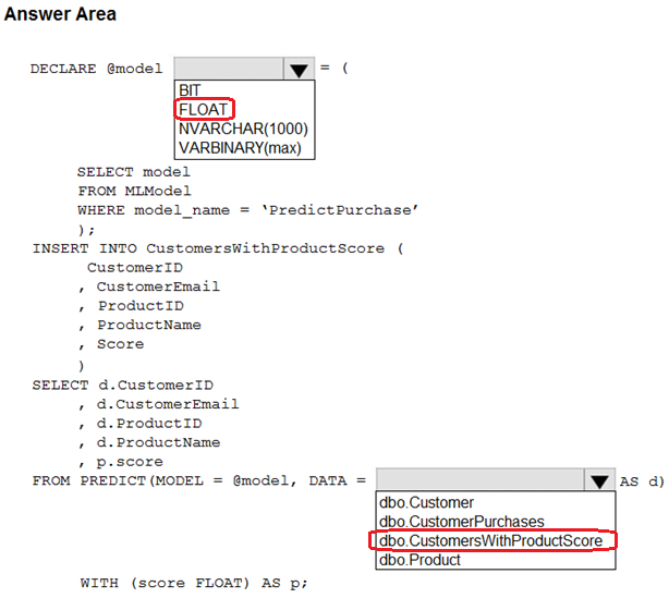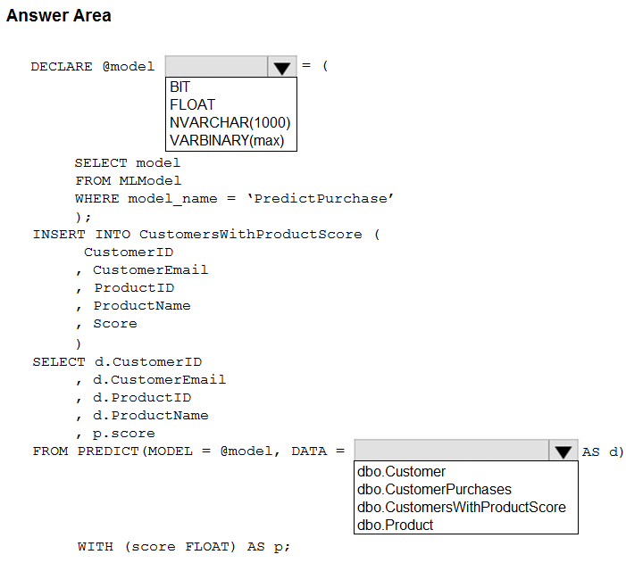 How should you complete the stored procedure? To answer, select the appropriate options in the answer area.