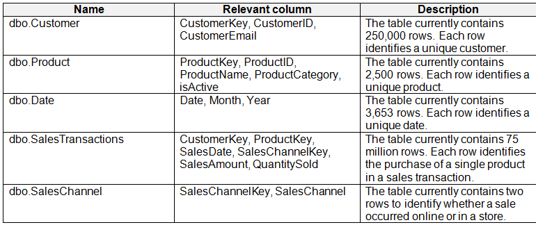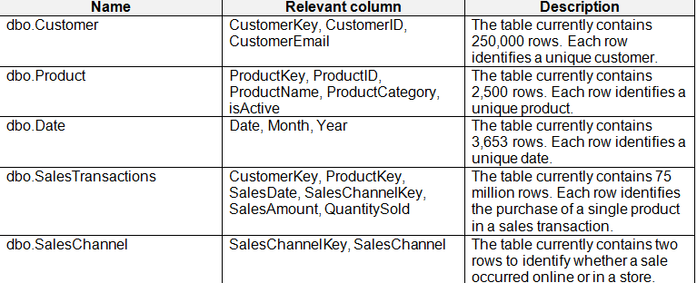 SQLDW contains a view named dbo.CustomerPurchases that creates a distinct list of values from dbo.Customer [customerID], dbo.Customer [CustomerEmail], dbo.Product [ProductID] and dbo.Product [ProductName].