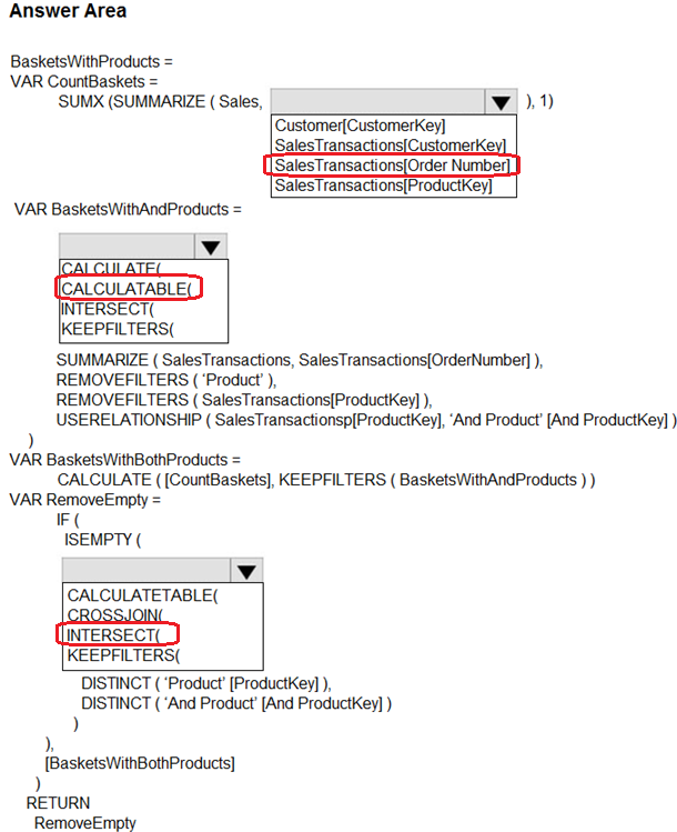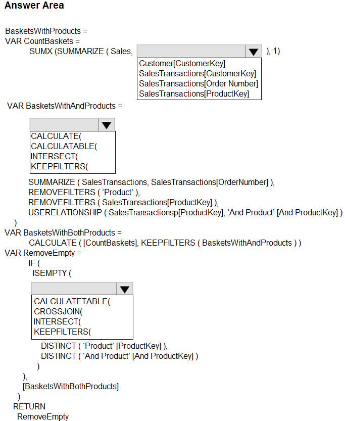 How should you complete the DAX expression? To answer, select the appropriate options in the answer area.