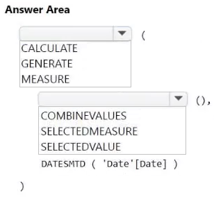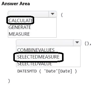 How should you complete the DAX expression? To answer, select the appropriate options in the answer area.