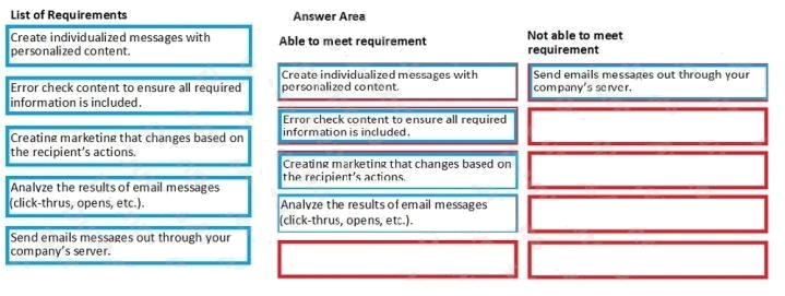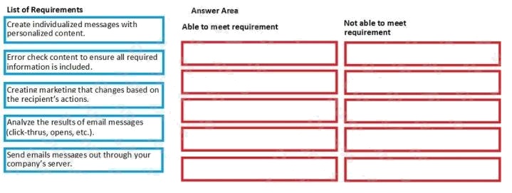 Which requirements will you be able to meet by utilizing the tools in Dynamics 365 for Marketing? To answer, drag the