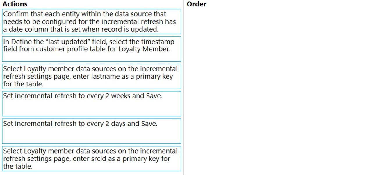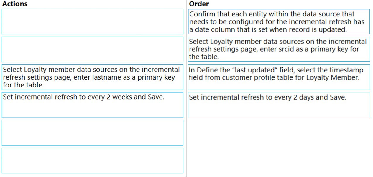 DRAG DROP You are a Customer Data Platform Specialist. You are implementing an incremental refresh in audience insights. All the data is stored in an Azure SQL database and is ingested to audience insights using Power Query. You need to configure an incremental refresh for data sources.