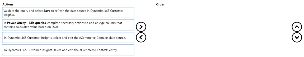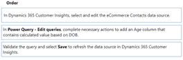 An organization uses Microsoft Power Query when connecting to data sources in Microsoft Dynamics 365 Customer Insights. You add an eCommerce Contacts data source to Dynamics 365 Customer Insights. The table contains the Contact's date of birth (DOB).