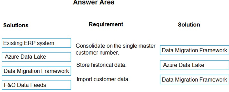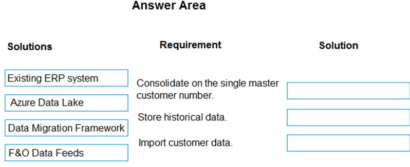 DRAG DROP A company is implementing Dynamics 365 Supply Chain Management. The company has 11 legal entities. Each entity uses a separate enterprise resource planning (ERP) system. A customer may have a unique customer number in each system because the systems are disconnected. One of the customer numbers will be used as the master number in Dynamics 365.