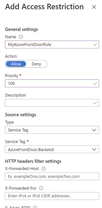 Solution: You recommend access restrictions that allow traffic from the Front Door service tags.