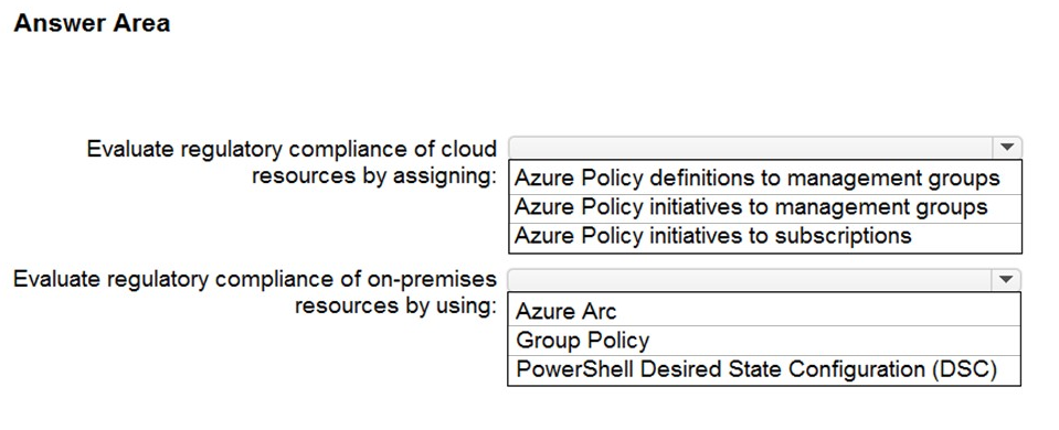 HOTSPOT You need to recommend a solution to evaluate regulatory compliance across the entire managed environment. The solution must meet the regulatory compliance requirements and the business requirements.