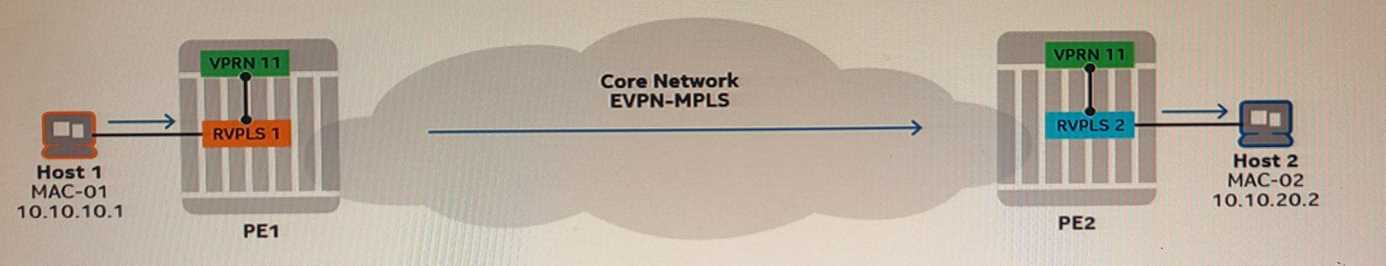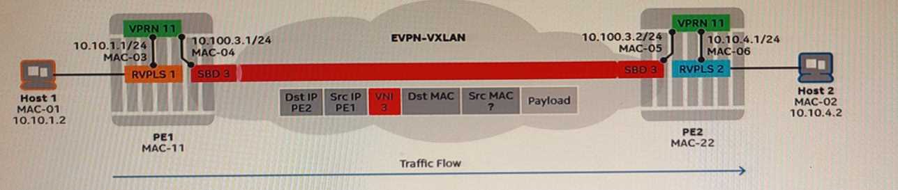 traffic to Host 2. MAC-01 is the MAC address of the SBD IRB interface configured in VPRN 11 on PE1